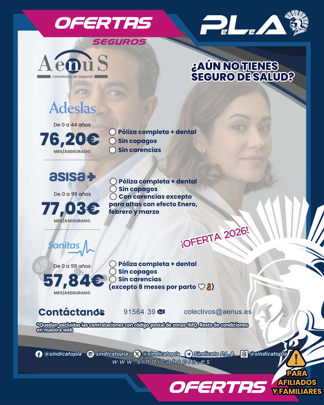 Para el Sindicato de Policía Local Asociada (PLA), la salud de nuestros miembros es una prioridad. Por ello, nos complace anunciar una asociación exclusiva con Aenus Correduría de Seguros, ofreciendo a nuestros miembros un seguro de salud integral con condiciones ventajosas para el año 2026.