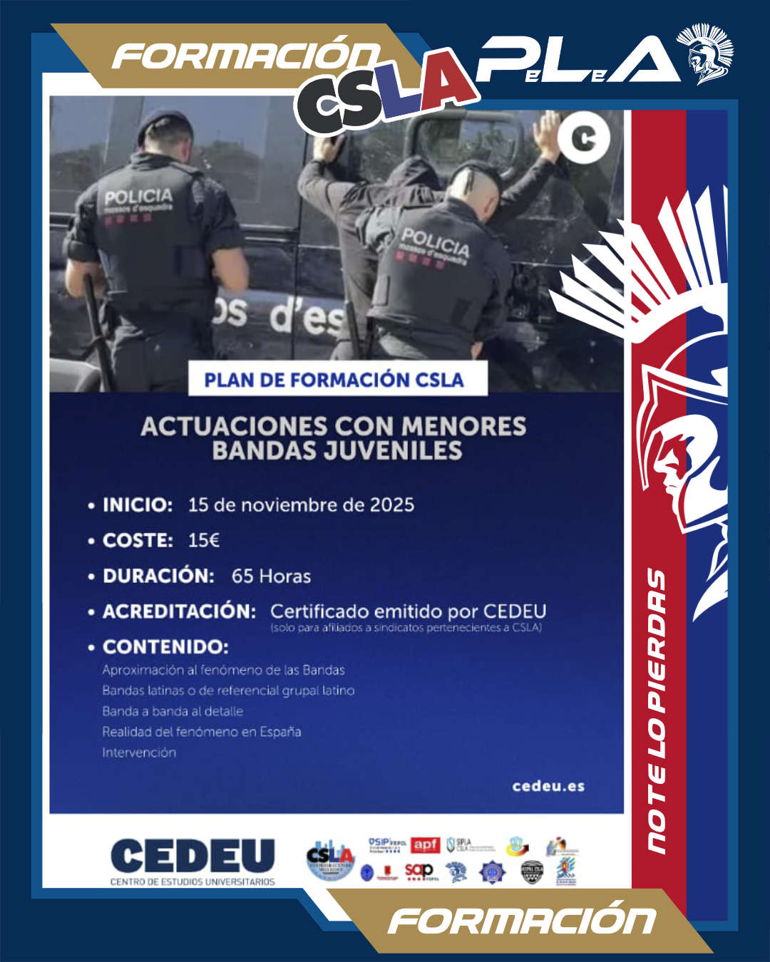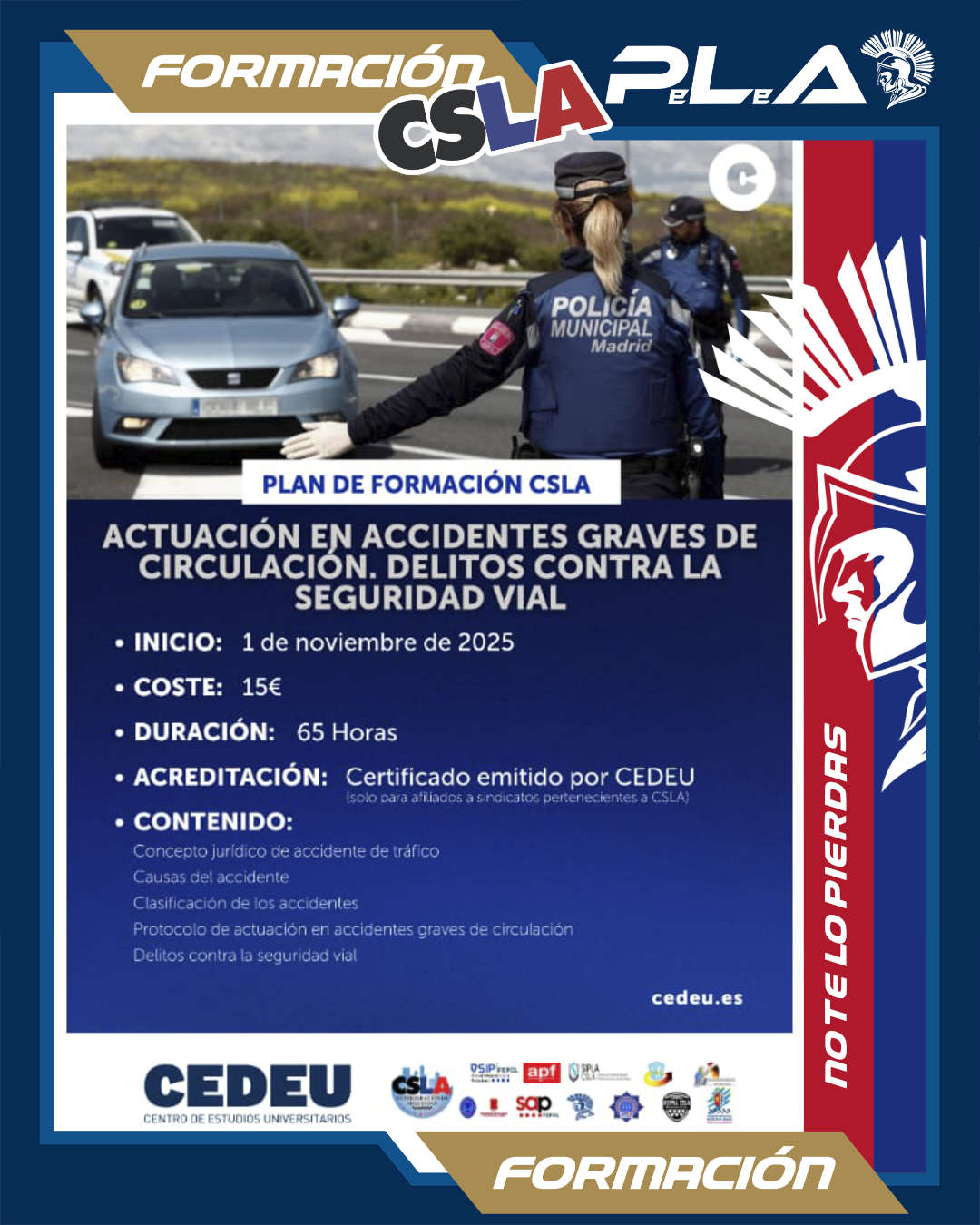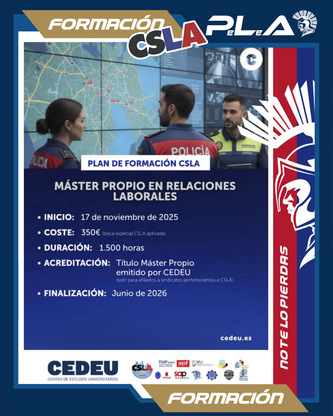 La confederación de Seguridad Local y Autonómica CSLA pone a disposición de todos l@s Policías afiliados al Sindicato de Policía Local y asociada P.L.A. las nuevas acciones formativas que se han preparado en relación con vuestro trabajo (Cursos interés policial, Másteres propios, intensivos de idiomas) 100% on-line, con profesorado cualificado y con unos precios al alcance de cualquier afiliado.