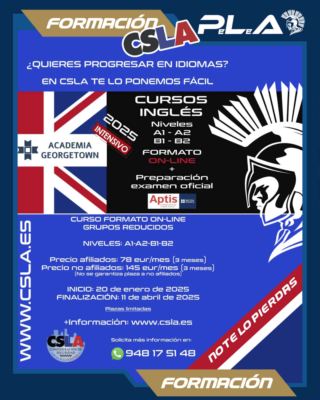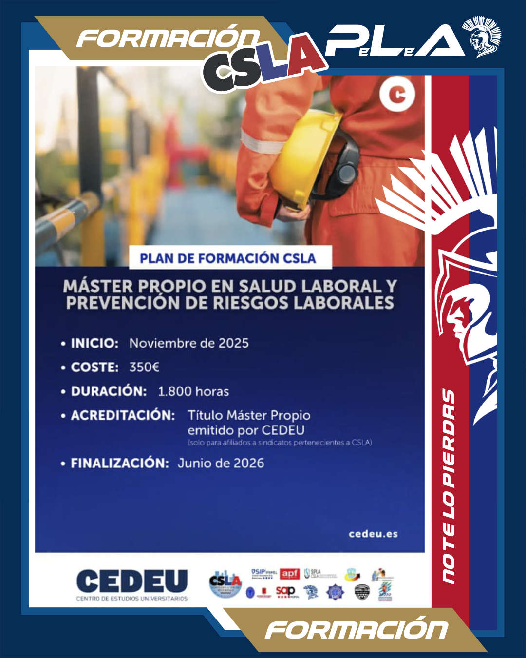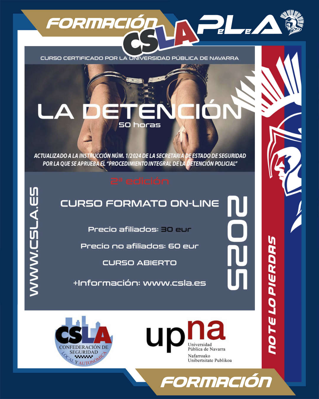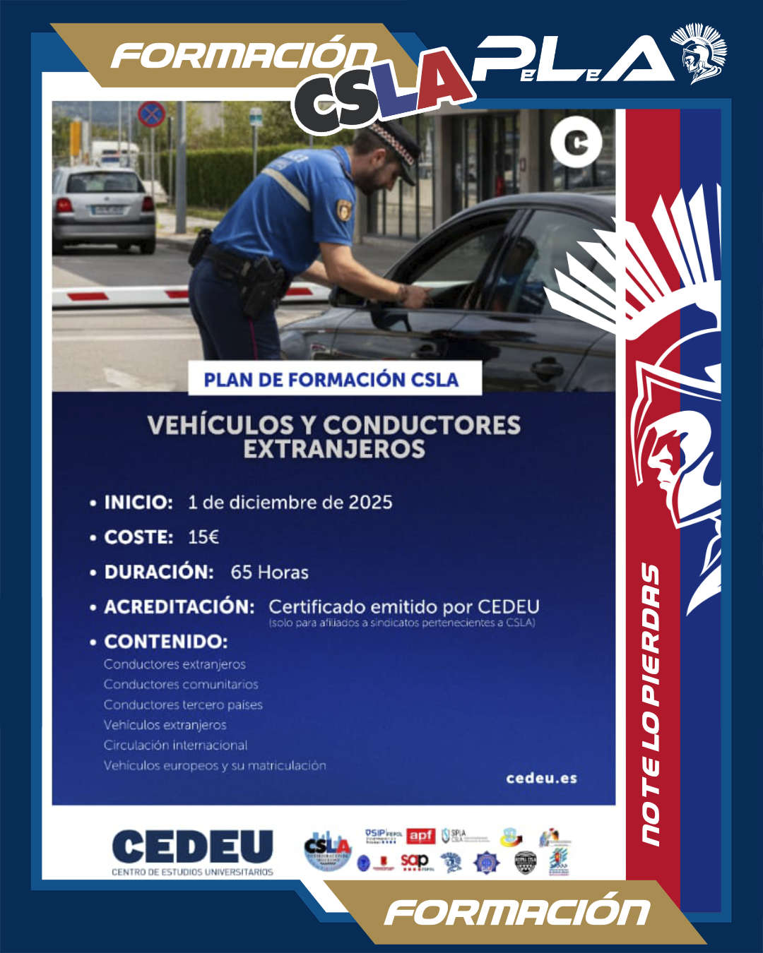 La confederación de Seguridad Local y Autonómica CSLA pone a disposición de todos l@s Policías afiliados al Sindicato de Policía Local y asociada P.L.A. las nuevas acciones formativas que se han preparado en relación con vuestro trabajo (Cursos interés policial, Másteres propios, intensivos de idiomas) 100% on-line, con profesorado cualificado y con unos precios al alcance de cualquier afiliado.