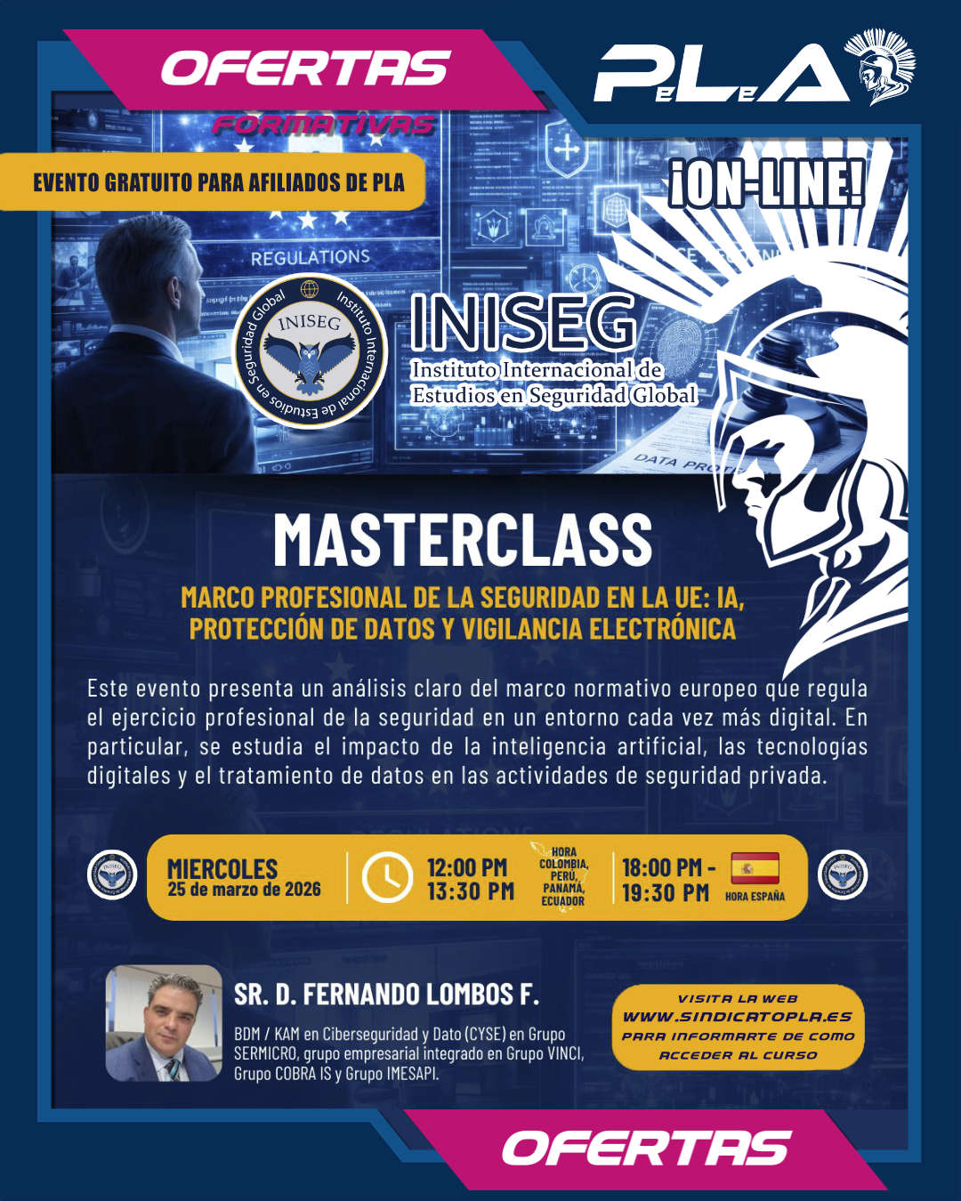 El sector de la seguridad profesional en la Unión Europea está viviendo una transformación sin precedentes. Por ello, hemos organizado la Masterclass: «Seguridad en la Unión Europea: IA, Protección de Datos y Vigilancia», de la mano del experto Fernando Lombos Fernández.